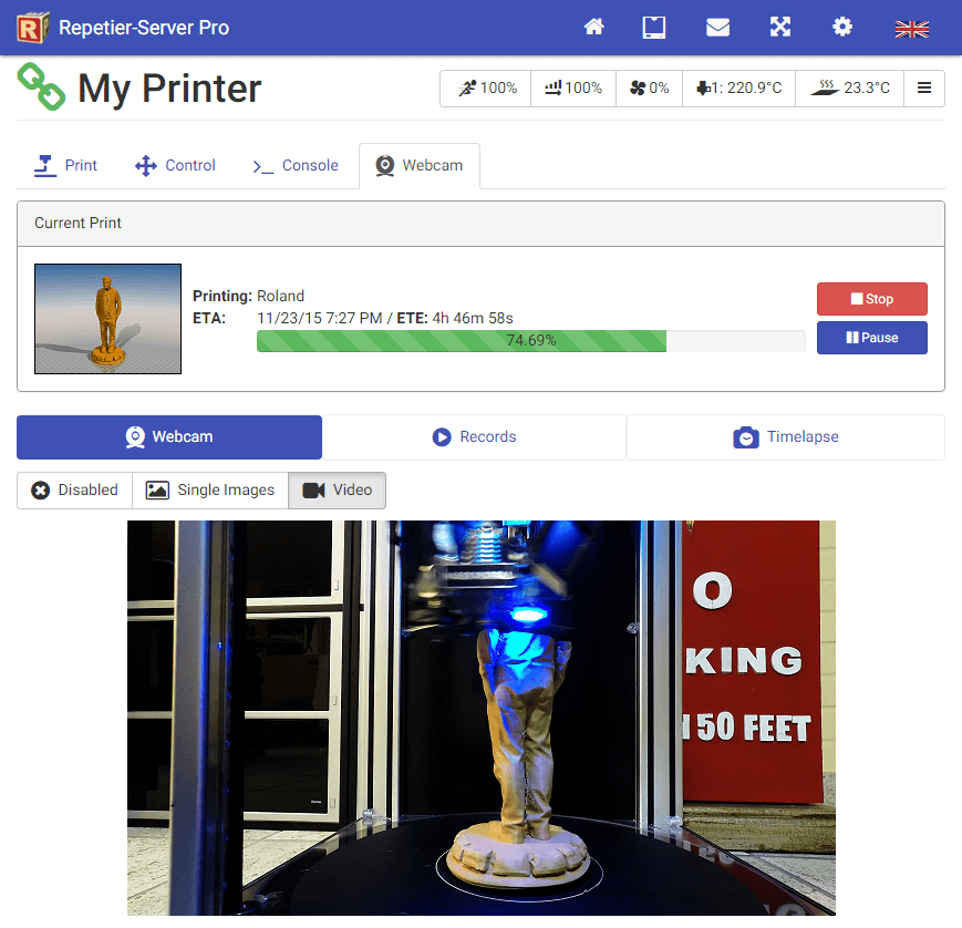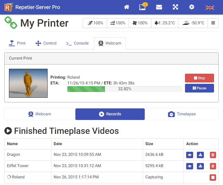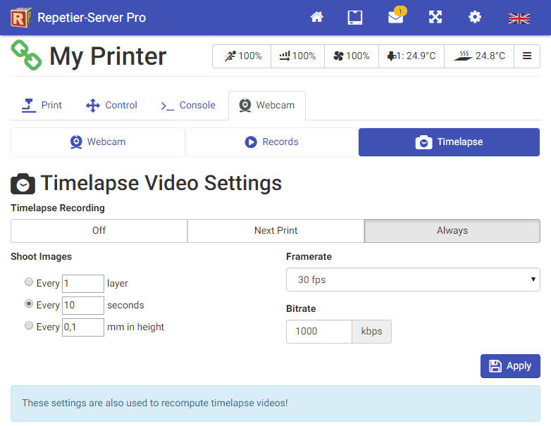 ПО:Repetier-Server/Документация/0.70/Управление принтером/Вебкамера (Webcam) и таймлапс (Timelapse)