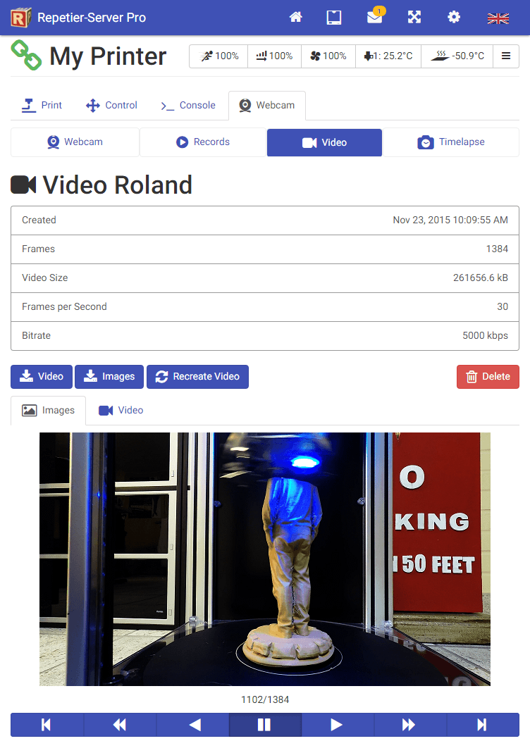 Если вы указали путь для FFMPEG (нажмите на иконку с шестеренкой, находящуюся на правой панели, затем на Global Settings и на Timelapse – это поле находится тут и называется FFMPEG Path), то для создаваемого MP4-видео можно указать также количество кадров в секунду (Framerate) и битрейт (Bitrate). Если FFMPEG не установлен, вы все еще сможете сохранять изображения и просматривать их как видео при помощи видеоплеера, встроенного в Repetier-Server.