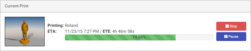 Когда печать будет запущена, вы увидите полосу загрузки, а над нею – две записи: ETA (расшифровывается как Estimated Time of Arrival, то есть «предполагаемый момент времени, когда печать будет завершена») и ETE (означает Estimated Time Enroute, то есть «предполагаемое время печати»). Кроме того, тут будут две кнопки: Stop – чтобы остановить печать, Pause – чтобы поставить ее на паузу.