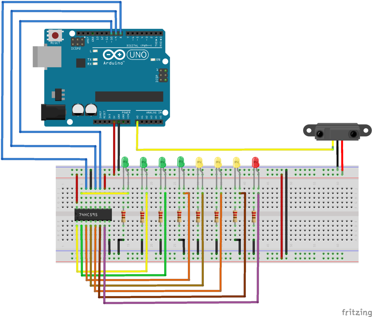 Данный пример демонстрирует как создать гистограмму расстояния с 8-ю светодиодами задействуя только 3 цифровых контакта Arduino и ИК-датчик расстояния. В этом нам поможет сдвиговый регистр 74HC595.